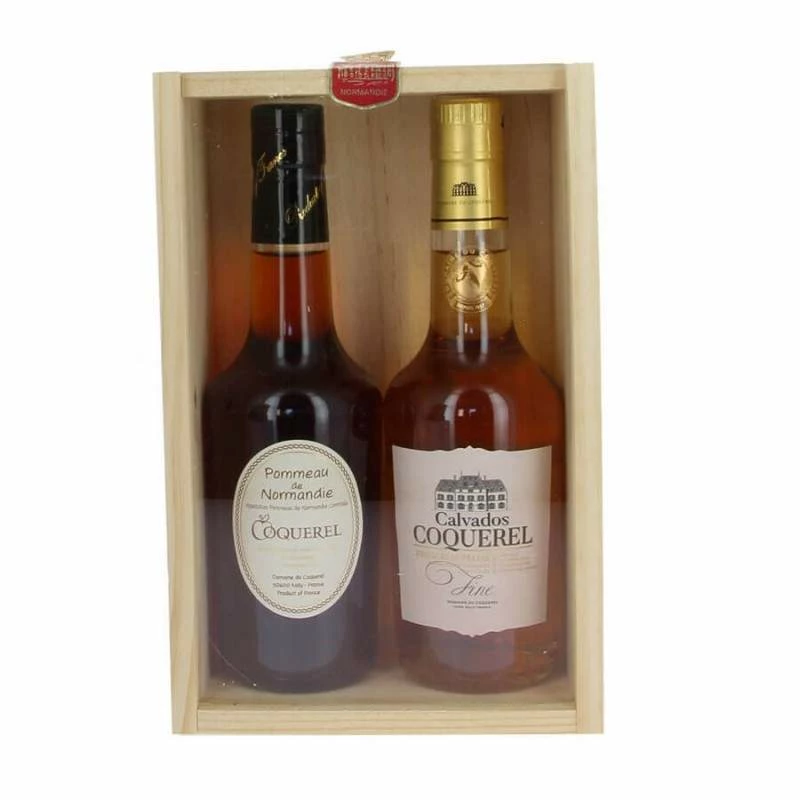 Un coffret bois contenant 1 demi-bouteille de Calvados fine et de Pommeau de Normandie pour découvrir les 2 grands produits cidricoles du manoir Coquerel.